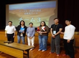 参加学生の投票で選ばれた、最優秀グループの表彰の様子。「砂漠化防止」のテーマはチーム3が選ばれました。