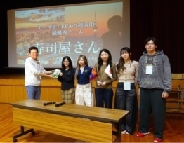 「日・モンゴルEPAの利活用」の学生投票最優秀グループの表彰の様子。チーム4「寿司屋さん(いつでも新鮮なネタが届けられるようにとの思いが込められている。)」が参加学生に選ばれました。