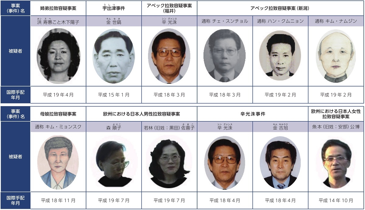 また、警察においては、朝鮮籍の姉弟が日本国内から拉致された事案1件(被害者2人)についても北朝鮮による拉致容疑事案と判断するとともに、北朝鮮工作員等拉致に関与した11人について、逮捕状の発付を得て国際手配を行っている。