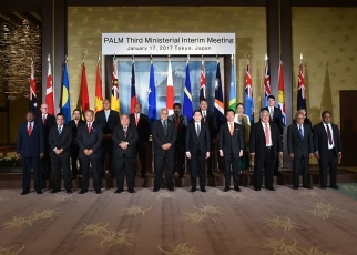 (1)平成29年1月17日,東京の外務省飯倉公館において,岸田大臣とローリン・S・ロバート・ミクロネシア連邦外務大臣の共同議長の下,太平洋・島サミット第3回中間閣僚会合(the 3rd Ministerial Interim Meeting of PALM : MIM3)が開催されました。会合には日本からは小田原政務官も出席し,16か国から外務大臣等の首脳及び閣僚級の関係者が参加しました。