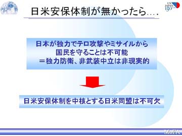 そういった二つのタイプの脅威、例えばテロ攻撃や伝統的な脅威、例えばミサイルによる攻撃から日本を守ることが必要です。自分だけでそれを果たすことは、非現実的だと私達は考えています。従って、どこかの国と同盟関係を結んで、その国と一緒に、具体的には安全保障条約によって日本を守るということになります。世界の中で、日本に対する武力攻撃が発生した時に日本を守ると言っている国はアメリカだけですが、それは安保条約上の義務なのです。