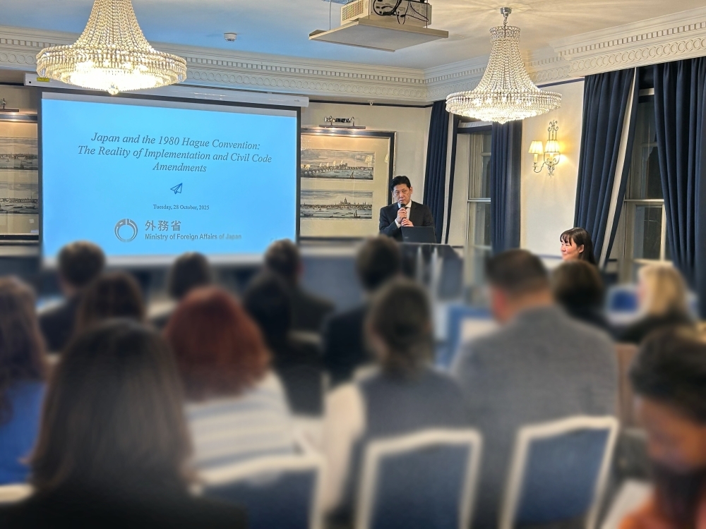 - 外務省は、日本が「国際的な子の奪取の民事上の側面に関する条約」(1980年ハーグ条約)を着実に実施していることを国外の関係者に周知することが重要との考えの下、今般、英国の法曹関係者を主な対象としてセミナー「Japan and the 1980 Hague Convention: The Reality of Implementation and Civil Code Amendments」を英国ロンドンで開催しました。また、国外からの関心の高さも踏まえ、2026年4月に施行される民法等改正(家族法分野)の内容についても説明する機会としました。