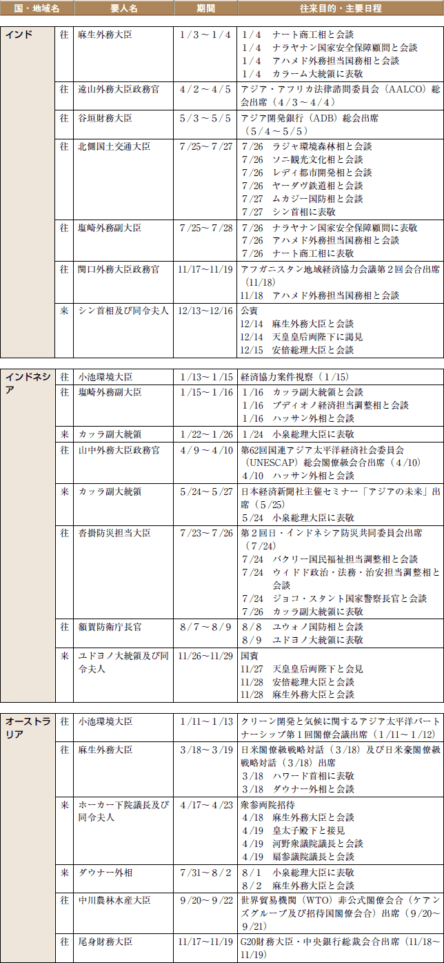 | 〈記載対象と留意点〉 1.対象期間は2006年1月1日から同年12月31日まで。 2.日本の要人の往訪については、基本的に皇族、総理大臣、総理大臣特使、閣僚、外務副大臣、外務大臣政務官、衆参両議院議長による外国訪問を記載。 3.各国・機関の要人の来訪については、基本的に各国外務大臣以上及び国際機関の長の来日であり、かつ、(1)日本の外務大臣以上の要人と会談などがあったもの、あるいは、(2)日本で開催された国際会議出席が目的であったものを記載。 4.日本の要人が国際会議出席の機会に第三国要人と会談を行ったものは、会議開催国への往訪における往来目的・主要日程の欄に記載。 5.要人の肩書は当時のもの。 6.期間はいずれも現地における滞在期間。 |