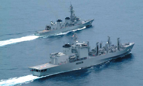 インド洋へ向かう護衛艦「むらさめ」(左)と補給艦「おうみ」(右)(写真提供:防衛省)