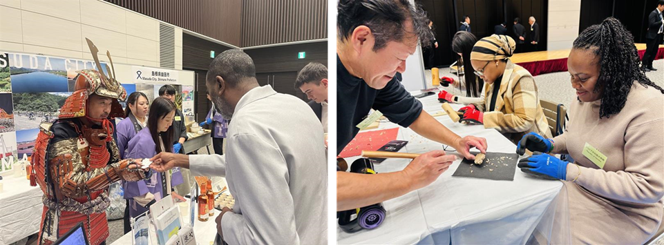 - 第二部 交流会 福井県は、ステージにおいて解説を行いながらそば打ちのパフォーマンスを行い「越前そば」を印象づけるとともに、ブースにおいては伝統工芸品である塗り箸の箸研ぎ体験を行い参加者と交流しました。また、おろしそば及び焼き鯖寿司の試食、並びに越前焼のお猪口を使用した日本酒試飲により食の魅力を紹介しました。 島根県浜田市は、ステージにおいて、第一部で紹介した石見神楽の演目の一部である4頭の大蛇の舞を生演奏とともに披露しました。ブースでは、演目で用いる大蛇との写真撮影や衣装などの展示を行い、石見神楽の魅力と職人の匠の技をPRしました。 島根県益田市は、ブースにおいて甲冑を着たスタッフが来場者と記念写真を撮影するなどしながら中世の面影が残るまちの魅力を伝えるとともに、ダムのない高津川の清流から作ったクラフトビール、日本酒、ウィスキー、焼酎、花わさび、鮎を試飲・試食により紹介しました。 長野県軽井沢町は、ブースにおいて軽井沢彫の体験を行い参加者と交流しました。また、軽井沢の自然が育んだワインやコーヒーの試飲、そばやジャムの試食などを行いながら、軽井沢観光の魅力を紹介しました。 駐日外交団等の参加者は、各自治体の魅力に触れ、ブースで自治体関係者と交流を行いました。