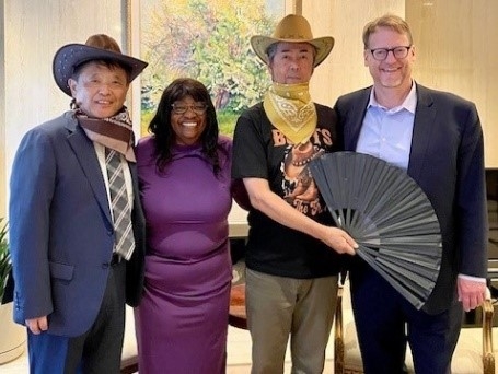 カーター市議から贈られたカウボーイハットを身につける藤田草津市教育長と岸守総領事(左から藤田草津市教育長、ブレンダ・カーター市議、岸守総領事、グレイメル・ポンティアック市長)