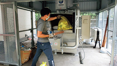 小型焼却炉チリメーサーにゴミを入れているところ。(写真提供:(株)トマス技術研究所)