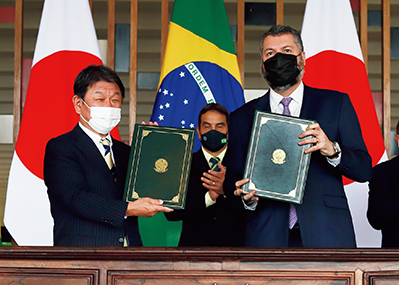 ブラジル訪問の際、アラウージョ外務大臣との、「ニオブ及びグラフェンの生産及び利用に関する協力覚書」および「アマゾン地域の生物多様性の持続可能な利用に関するトメアス協力覚書」の署名式に臨む茂木外務大臣(2021年1月)