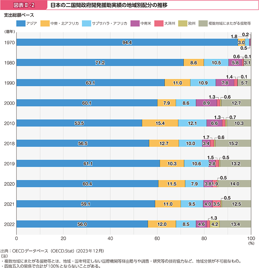 地域別の二国間ODAの実績値(「開発途上地域」指定国注4向け援助を含む)を構成比(支出の総額)順に記載すると次のとおりです注5(詳細は図表Ⅱ-2および図表Ⅳを参照)。