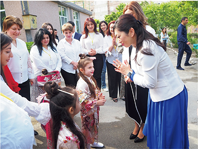 5月、日本の支援によって校舎が改修されたアルメニアのエチミアジン市立第13幼稚園を訪問する吉川外務大臣政務官(当時)