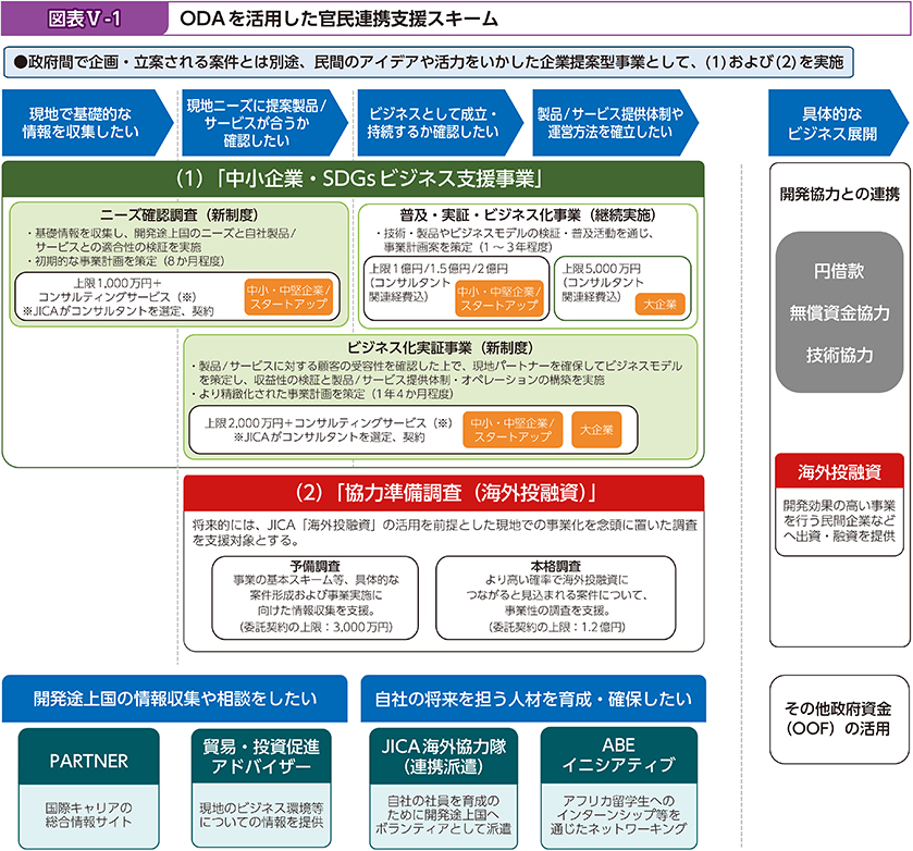 - 民間企業からの提案に基づき、開発途上国の開発ニーズと企業が有する優れた製品・技術等とのマッチングを支援し、開発途上国での課題解決に貢献するビジネスの形成を後押しするもの。また、本事業は、日本の中小・中堅企業の海外展開を支援するのみならず、日本国内の経済や地域活性化を促進することも期待されている(図表Ⅴ-1も参照)。