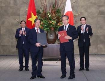 12月16日、日ASEAN特別首脳会議の機会に行われた日・ベトナム首脳会談において、岸田文雄内閣総理大臣及びファム・ミン・チン・ベトナム社会主義共和国首相(H.E. Mr. Pham Minh Chinh, Prime Minister of the Socialist Republic of Viet Nam)立ち会いの下、山田滝雄駐ベトナム社会主義共和国日本国特命全権大使とレ・タン・カン・ベトナム社会主義共和国財政副大臣(Mr. Le Tan Can, Deputy Minister of Finance of the Socialist Republic of Viet Nam)、ダオ・ホン・ラン・ベトナム社会主義共和国保健大臣(H.E.Ms.Dao Hong Lan, Minister of Health of the Socialist Republic of Viet Nam)及びグエン・キム・ソン ・ベトナム社会主義共和国教育訓練大臣(H.E. Mr. Nguyen Kim Son, Minister of Education and Training of the Socialist Republic of Viet Nam)との間で、412億2,370万円を限度とする円借款(注1)1件及び総額25億1,500万円を限度とする無償資金協力2件に関する書簡の交換が行われました。