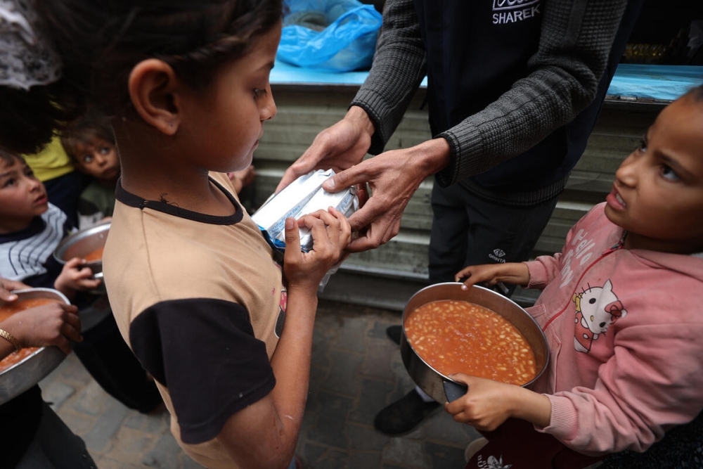 ハンユニスのキッチンで温かい食事を受け取る子ども(パレスチナ・ガザ地区)