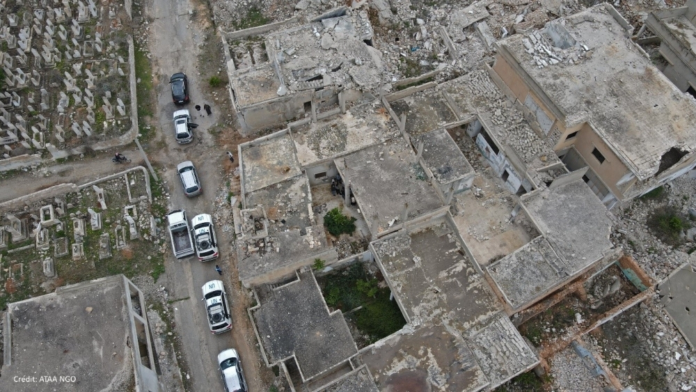 シリア北西部イドリブ周辺のニーズ調査を行う様子。人道基金は、内戦の前線で破壊された家屋や給水所の修復を助成しています。