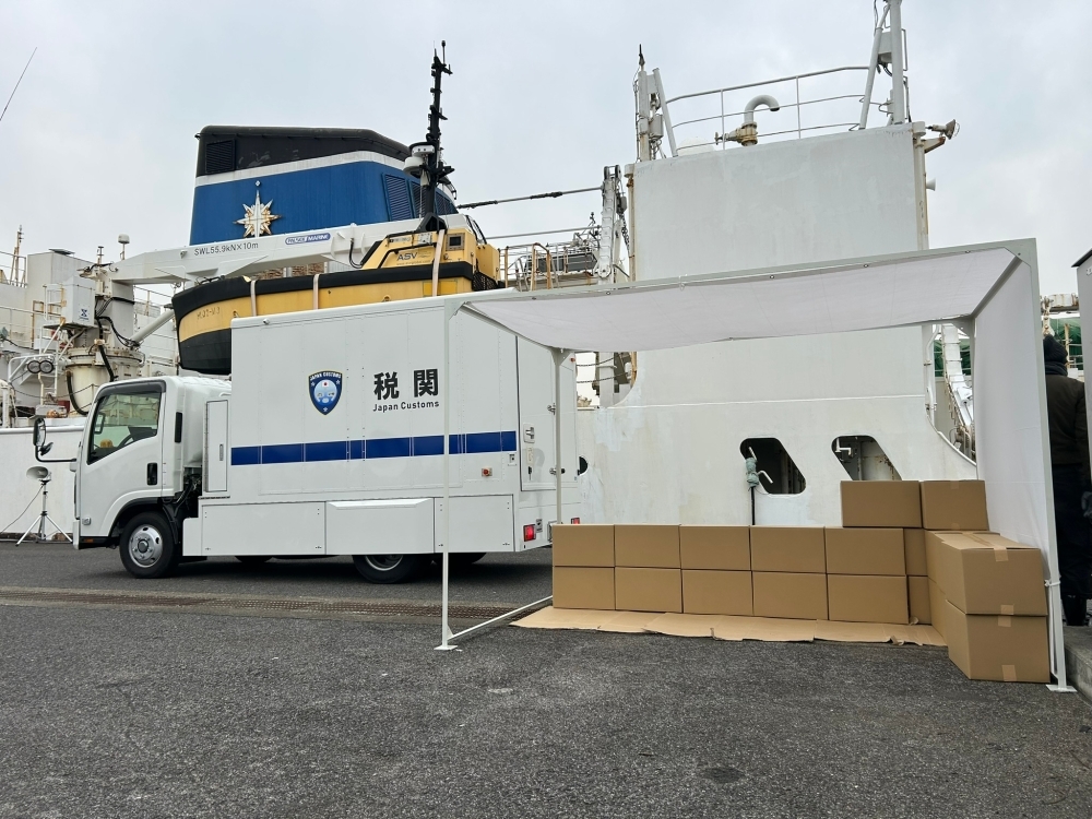我が国周辺でテロ活動を計画している組織が関与した積荷を搭載した可能性のある貨物船が、我が国に入港するという想定の下、警察、税関及び海上保安庁合同チームが、当該貨物船の立入検査を実施し、税関が化学兵器に転用可能な物質であることを特定の上、警察のNBCテロ対応部隊が回収・除染するまでの一連の動きにつき、訓練を実施しました。