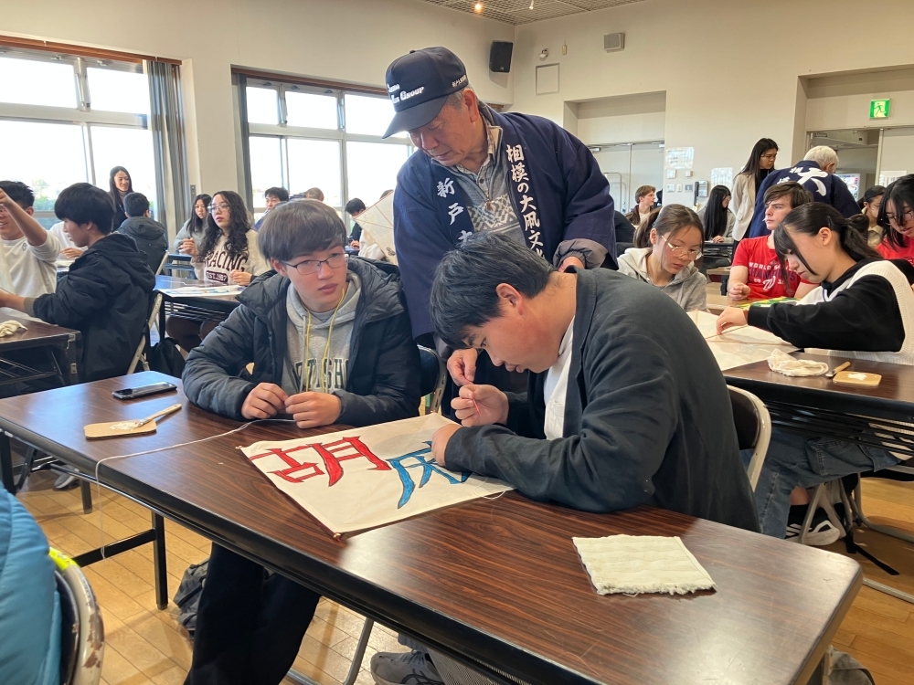 午前に、学生たちは相模の大凧センターを訪れました。ここでは、相模の大凧文化保存会の指導の下、日米学生が2人1組で実際にミニチュア凧を制作し、また、凧揚げも体験しました。学生たちは、これらの活動を通じて、この地域で古くから継承される伝統的な大凧の文化を学びました。