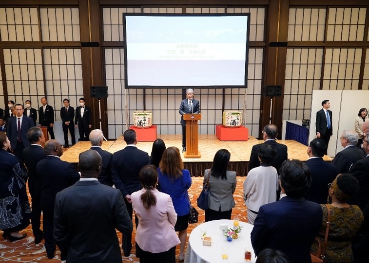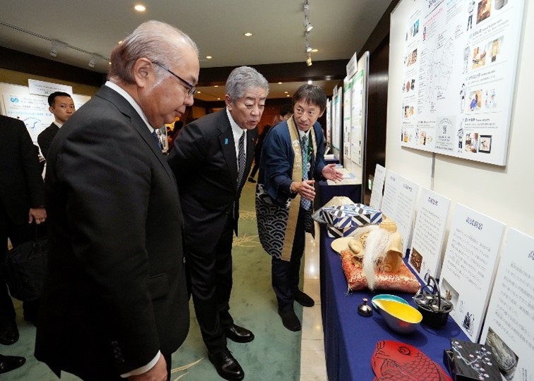 On October 15, the Minister for Foreign Affairs and the Governor of Toyama Prefecture co-hosted a reception “-Sushi. Now That's Toyama Sharing (Osusowake) Our Bountiful Food, Culture, Nature, and Industry with the World” at the Iikura Guest House, attended by approximately 170 people, including diplomatic corps to Japan. The reception featured booths introducing local food including sushi, Japanese sake, tourism, traditional crafts, well-being initiatives, recovery and reconstruction efforts following the earthquake, as well as Owara Kaze no Bon dance performance on stage to promote diverse charms of Toyama Prefecture.