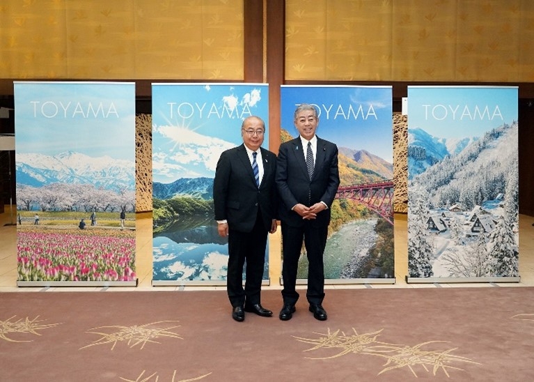 Photo of Foreign Minister IWAYA with Governor Nitta of Toyama Prefecture