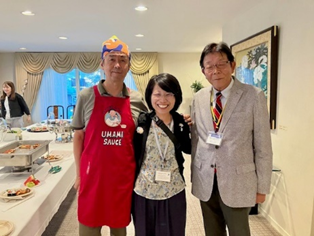 Consul General Kishimori at a culinary exchange event, wearing an apron featuring "Kimono Mom", a popular YouTuber in the US