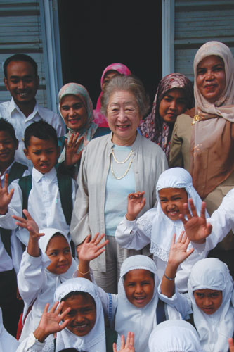 Sadako Ogata with children at the tsunami site, where JICA provided assistance in collaboration with the NGOs (Photo: JICA)