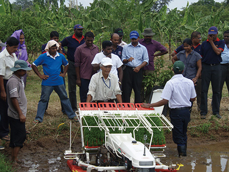 Senior volunteer demonstrates rice planting in Sri Lanka, where the practice is not prevalent. (Photo: Hiroshi Furukawa/JICA Sri Lanka Office)