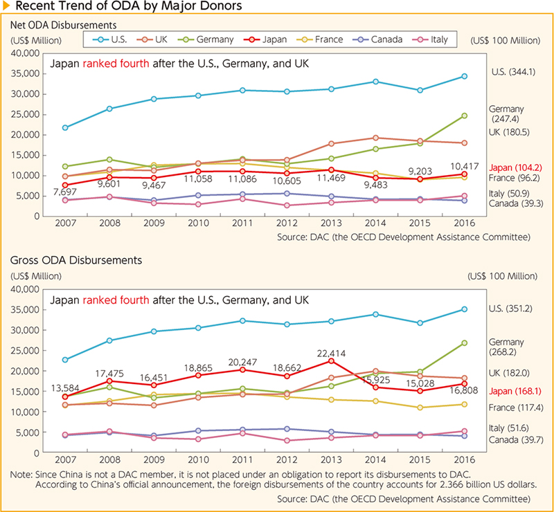 In 2016, Japan provided approximately 16.81 billion US dollars in ODA3, 11.8% more than the previous year on the basis of gross disbursements. Japan ranks fourth among the member states of the Development Assistance Committee of the Organisation for the Economic Co-operation and Development (OECD/DAC), following the U.S., Germany, and the UK. In terms of net disbursements generally used for international comparison, the amount was about 10.42 billion US dollars, up 13.2% from the previous year, and like for gross disbursements, ranking fourth after the U.S., Germany, and the UK. The ODA/GNI ratio based on net disbursements was 0.20%, ranking 20th among member states of the DAC.