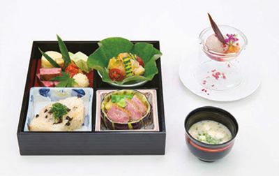 Repas servi au déjeuner de travail (riz blanc de Fukushima, en bas à gauche)Le 28 juin, Osaka