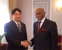 ![]() Parliamentary Secretary Onodera (left) and President Abdoulaye Wade of Senegal (right) |